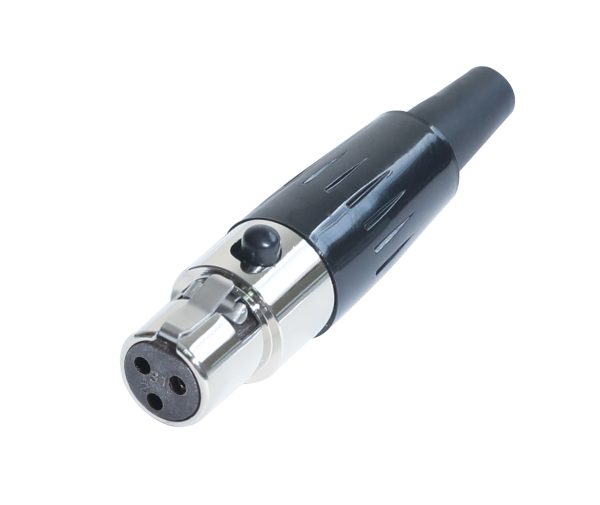 3 pole female cable connector with nickel or black housing; contacts of gold or silver;black, white, or skin plastic cap