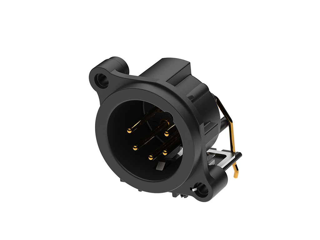 5 pole XLR plastic male receptacle, grounding: separate ground contact to mating connector shell and front panel, horizontal PCB mount